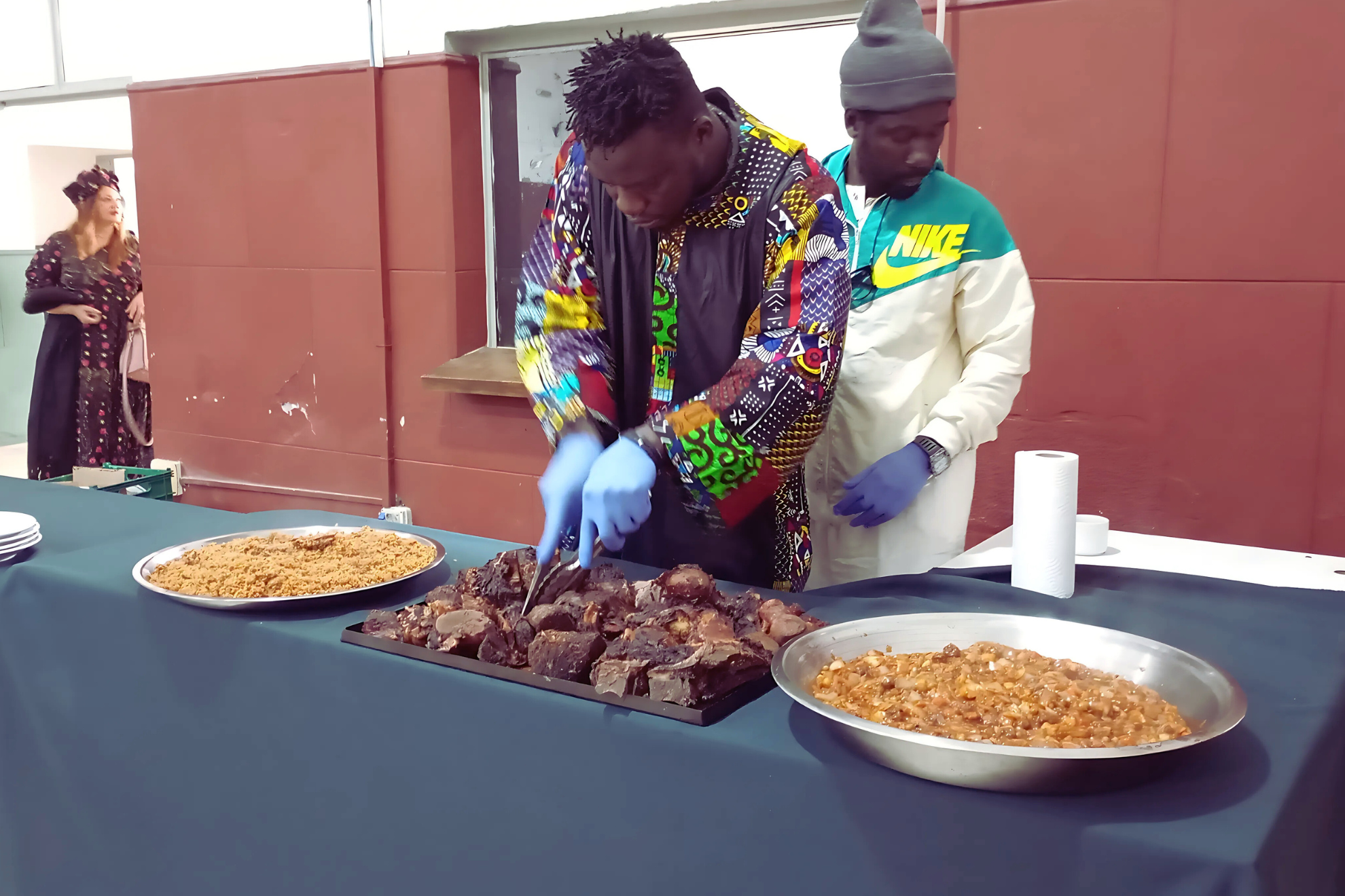 El momento del almuerzo llegó de repente, y en un abrir y cerrar de ojos, los invitados formaron una larga fila para degustar los platos caseros como el thiéré (trigo burgol), ceebu yaap (arroz) y el dibi de carne y pollo con mucha cebolla y condimentos que hicieron subir la temperatura de los comensales, durante un típico día de invierno. Los propios senegaleses fueron los encargados de servir, con una sonrisa, platos abundantes, bebidas y postres. “Compartir la comida es para nosotros, lo más importante, es un gesto de hermandad y agradecimiento, con toda la comunidad”.