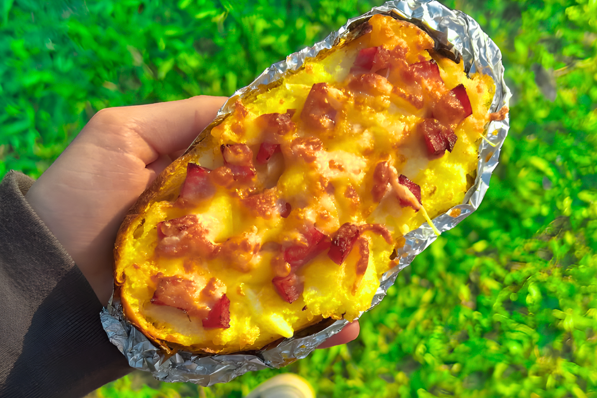 El menú combina propuestas clásicas, opciones vegetarianas y alternativas veganas. Cada papa se prepara al horno y se sirve con rellenos frescos y caseros. Así, esta sencilla receta se convierte en un ida y vuelta entre culturas, donde el sabor es una forma de encuentro.