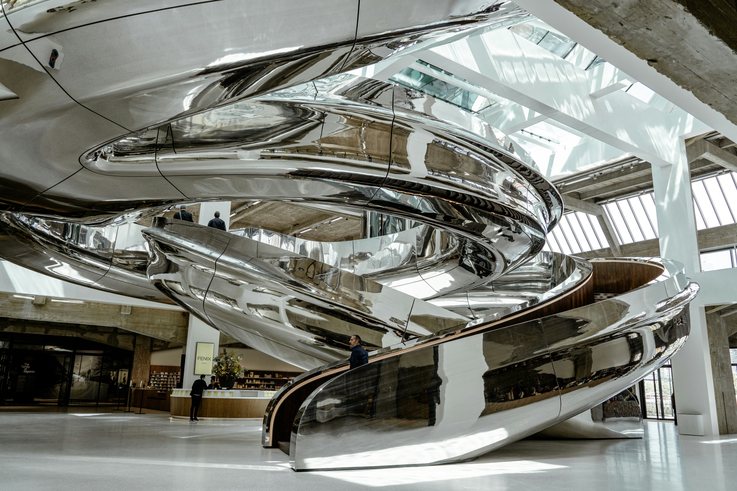 —Como te comenté anteriormente, Fenix da espacio a más de cien artistas de todos los continentes. Demuestran que la migración es atemporal y universal. Además de la colección de arte internacional, se puede ver el Laberinto de Maletas, compuesto por dos mil maletas donadas por particulares. También está la exposición de fotografía documental The Family of Migrants, con casi 200 fotos sobre el tema de la migración, creadas por 136 fotógrafos en 55 países. En la planta baja se encuentra Plein: una plaza cubierta de la ciudad de 2.000 metros cuadrados que está abierta a las ideas de todos para crear programas junto con Fenix. Varias cocinas en Fenix también cuentan historias sobre la migración: en la cafetería y panadería del museo, la heladería y en Plein. La obra de arte más grande y llamativa de Fenix es el Tornado Metálico de treinta metros de altura, donde dos escaleras entrelazadas se elevan desde el atrio a través del techo de cristal sobre el almacén y se unen de nuevo en la cubierta panorámica.