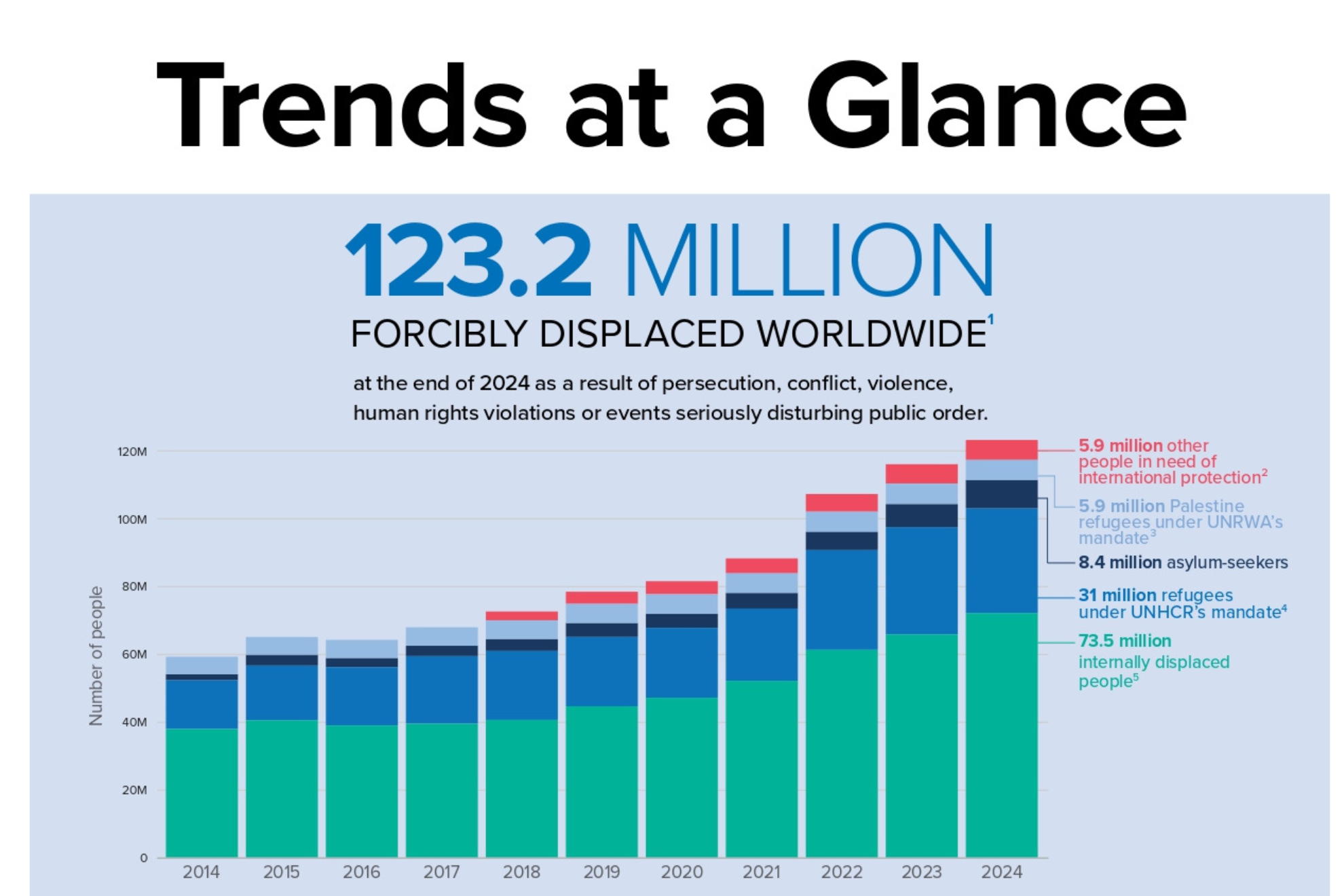 Según datos del reciente informe de Tendencias Globales de ACNUR, 123,2 millones de personas han sido desplazadas por razones de persecución, conflictos armados y violaciones a los derechos humanos, de las cuales 31 millones corresponden a refugiados bajo la protección de ACNUR y 5,9 millones de personas pertenecen a otras categorías en necesidad de protección internacional, más allá del estatus formal de refugiado o solicitante de asilo.