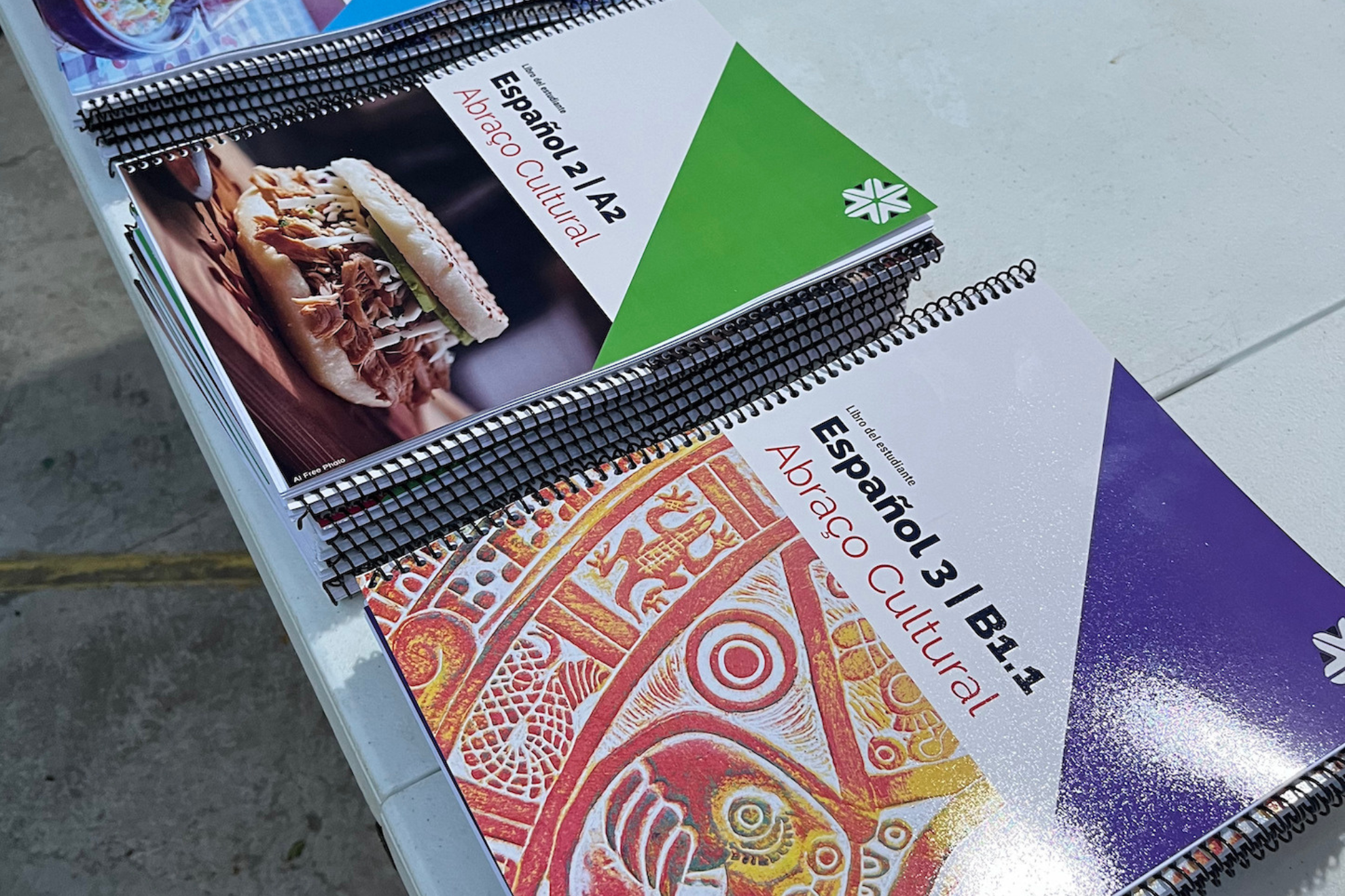 Algo que diferencia a Abraço Cultural de otros centros de idiomas son los materiales pedagógicos con los que se trabaja. Suponen un desafío porque se trata de un material propio que se va desarrollando y que, como describe Toffoli, “es colaborativo”. Si bien están basados en el marco común europeo, “tienen nuestro toque”, añade. En ese toque, abarcan otros saberes y otros encuadres, tanto investigados y desarrollados por el equipo administrativo y pedagógico de Abraço, como incluyendo la mirada y realidad del profesorado. “La propuesta de Abraço tiene una perspectiva muy decolonial. Las personas que trabajan aquí vienen del Sur Global, y por eso es importante que se sientan representadas en el material didáctico, porque entendemos que es necesario que los profesores y profesoras hablen de ellos y de sus orígenes. En general, por mi experiencia aquí en Brasil, las referencias vienen del Norte Global, entonces cuando se piensa en el francés, la referencia es Francia, pero no son sólo esos países que hablan ese idioma. En Abraço Cultural ninguno de nuestros profesores de francés viene de Francia, vienen todos de África”, reflexiona Toffoli, quien añade, que es un material que cuando pueden, lo van repasando, releyendo, renovando, porque “un material de 2025 no puede ser el mismo material de 2017”.