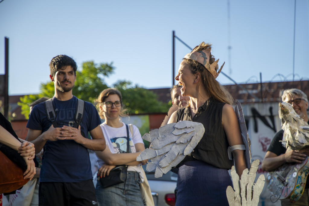 Lucie Bach, artista franco-chilena radicada en Argentina desde 2017, forma parte del colectivo escénico Embajada Efímera, responsable de este proyecto. Llegó a la obra a través de una convocatoria impulsada por sus directores Matt Wray y Felipe Rubio. Desde entonces, su propio recorrido migrante se entrelaza con la propuesta: una especie de ciudad imaginaria que se arma y se desarma. Cada escena es como una entrada a otro territorio, a otra memoria, a otro país. Y en ese recorrido se vuelve inevitable preguntarse qué es lo que permanece y qué se vuelve efímero.