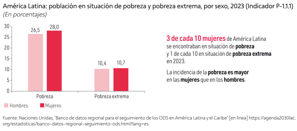 El informe muestra que, aunque la incidencia general de la pobreza se redujo en las últimas décadas, la desigualdad de género dentro de la pobreza no solo persiste, sino que se profundiza. En 2023, 3 de cada 10 mujeres en América Latina vivían en situación de pobreza y 1 de cada 10 en pobreza extrema. En términos comparativos, había 121 mujeres en situación de pobreza y 120 en pobreza extrema por cada 100 hombres, lo que confirma la feminización estructural de la pobreza en la región.