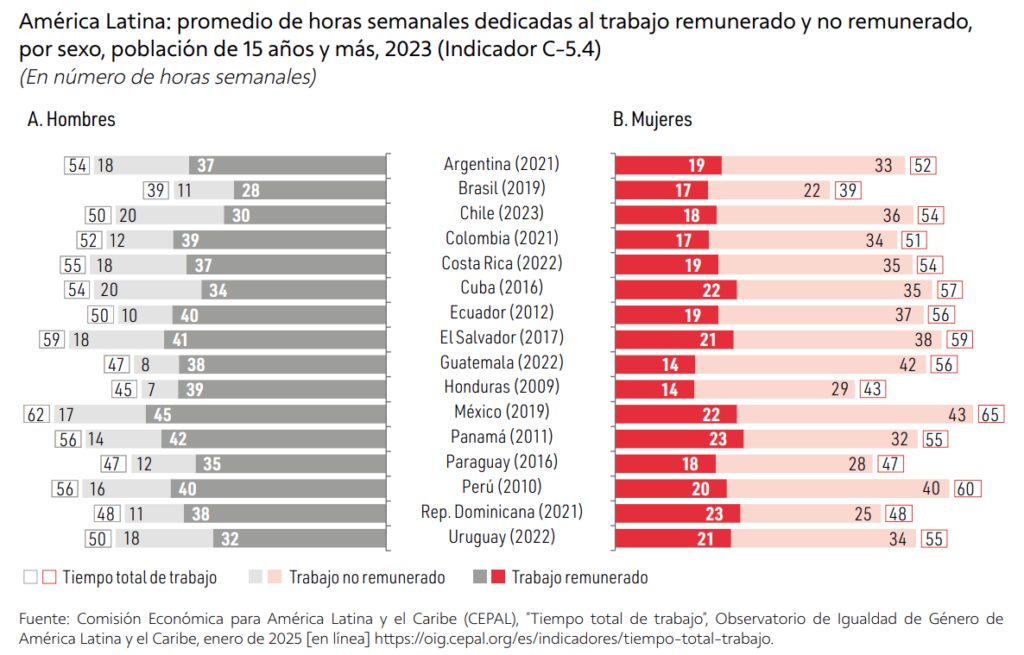 Estas brechas se explican, en gran medida, por la organización social del cuidado. En América Latina, las mujeres dedican entre el 12% y el 24,2% de su tiempo al trabajo doméstico y de cuidados no remunerado, mientras que los hombres destinan entre el 3% y el 12,5%. Esta distribución desigual del tiempo limita el acceso de las mujeres al empleo formal, la capacitación, la participación política y el descanso.