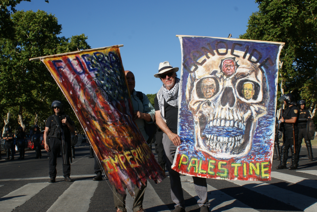 Entre las consignas exhibidas en carteles y pancartas se leían frases como “Ni Trump libera, ni Milei es libertad”, “Váyanse al carajo yankis de mierda” y “Trump, tu droga es el petróleo”. Los manifestantes cuestionaron de manera explícita el rol injerencista de Estados Unidos y rechazaron el uso del discurso de la democracia y la libertad para justificar la intervención armada.