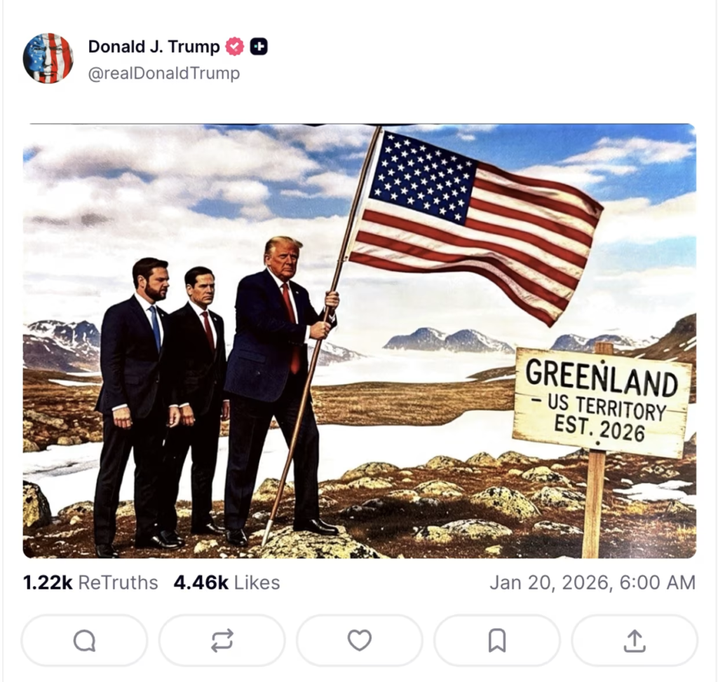 Imagen generada con IA publicada en Truth Social publicada por el presidente Donald Trump | Imagen: captura de la cuenta @realDonaldTrump en Truth Social, 20 de enero de 2026