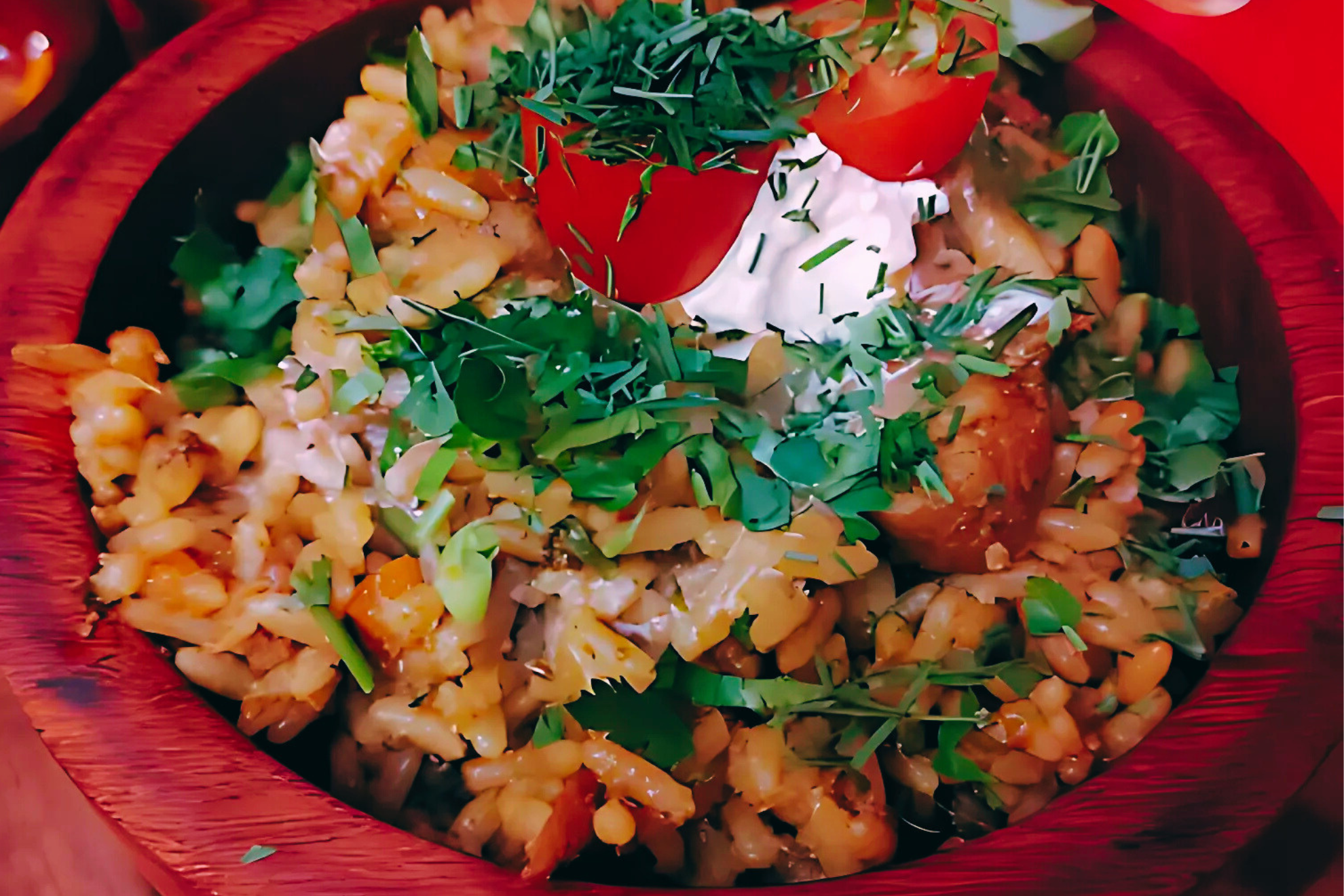 El plato principal fue una sorpresa total: un risotto ruso con carne de cerdo, inspirado en la gastronomía tártara y kazaja. La base es un arroz cocido a fuego lento con 14 especias diferentes, que le dan un sabor profundo y súper aromático. La carne de cerdo, tierna y jugosa, se marina antes de cocinarse, potenciando aún más el plato.