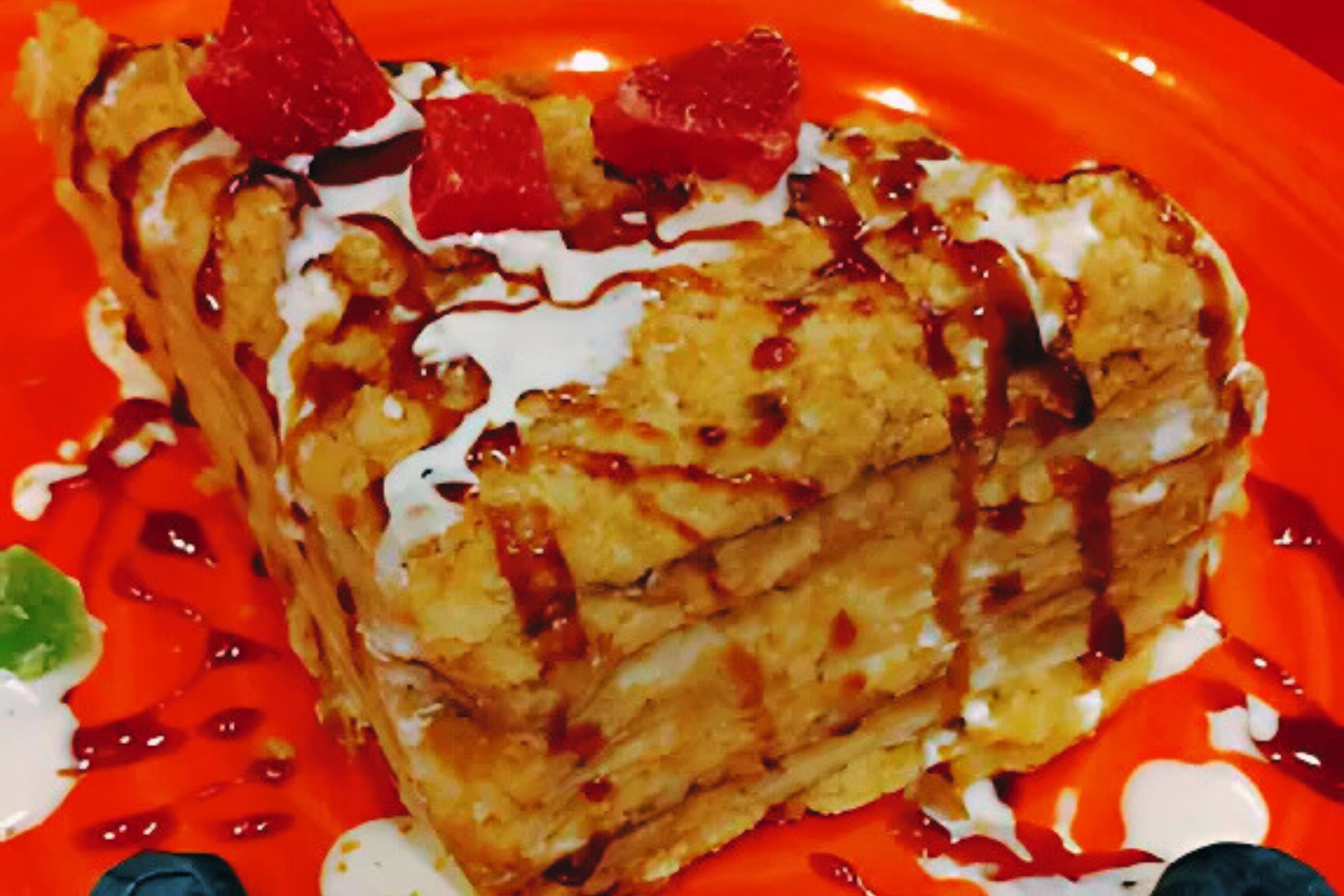 Para cerrar la noche, no podía faltar un clásico de la repostería rusa: la Torta Napoleón. Similar a la milhojas, pero con su propia personalidad, esta delicia tiene capas finísimas de masa hojaldrada y una crema pastelera casera que se deshace en la boca. Dulce en su justa medida, ligera y con ese toque casero que la hace irresistible.