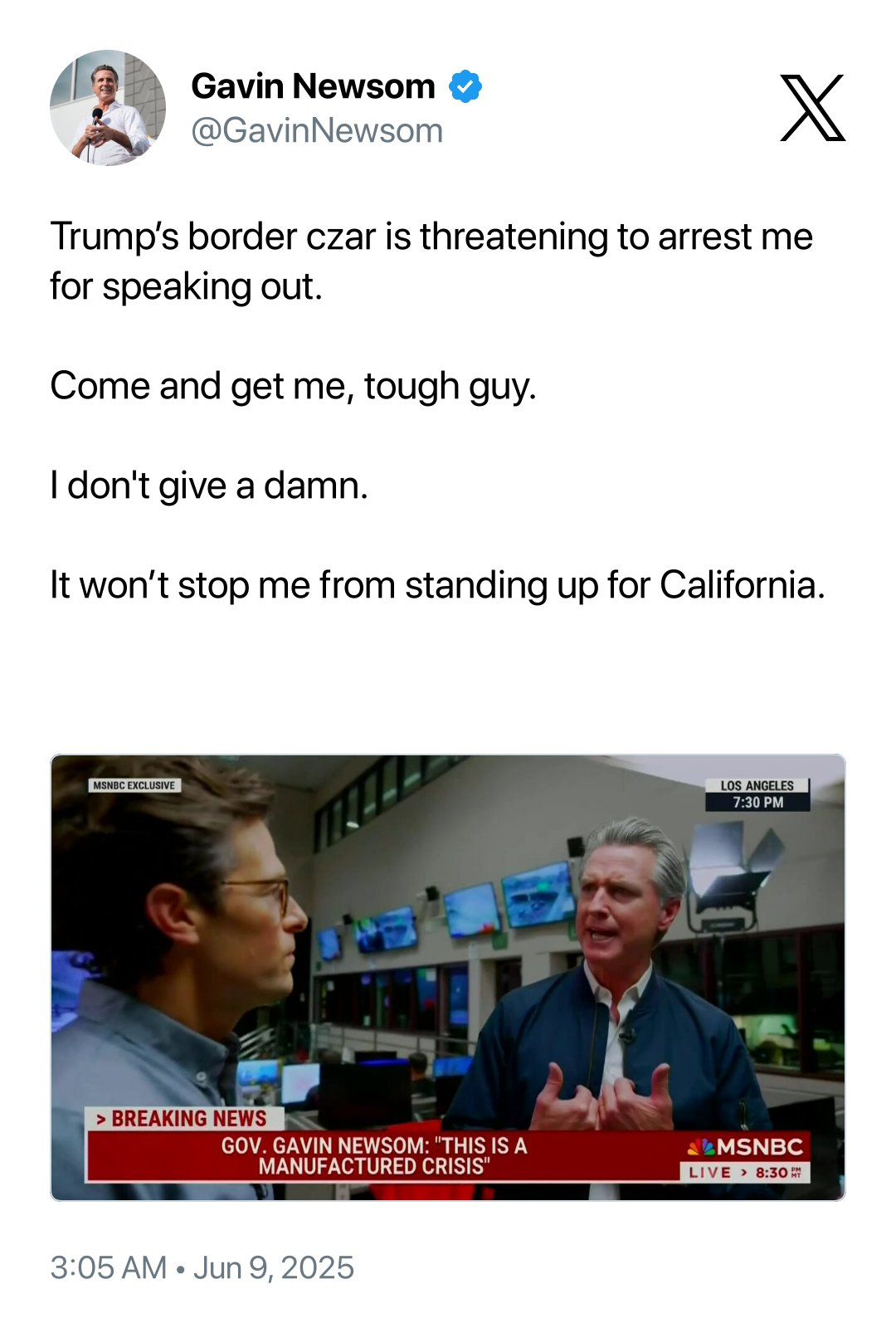 “El envío de las Guardia Nacional sólo va a empeorar las cosas”, declaró Newsom durante una entrevista exclusiva de Fox News. Además, calificó a Trump como un “mentiroso de sangre fría” e incluso desafió a Tom Homan, el ex director del ICE y actual “zar de la frontera” de la administración Trump, a detenerlo. En las horas previas, Homan había sugerido que podían llegar a detener a Newsom y a la alcaldesa Bass por “excederse en sus competencias”.
