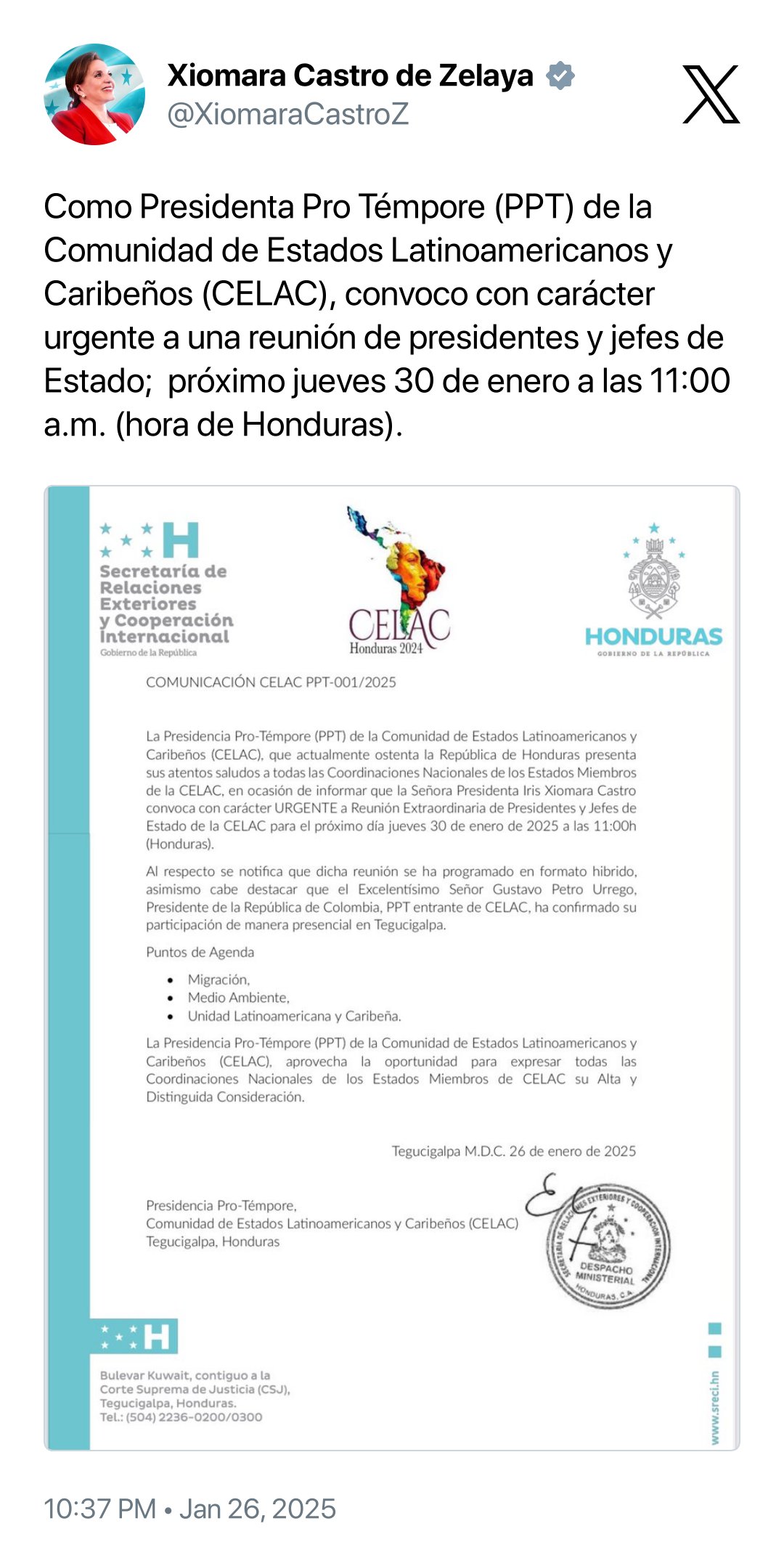 El reciente conflicto diplomático entre el presidente Donald Trump y su par colombiano Gustavo Petro en torno a las deportaciones de personas migrantes en situación irregular desde los Estados Unidos, ha encendido algunas alarmas en la región. En este marco, la presidenta de Honduras, Xiomara Castro, convocó a una reunión “urgente” de la Comunidad de Estados Latinoamericanos y Caribeños (CELAC), programada para este próximo jueves 30 de enero.
